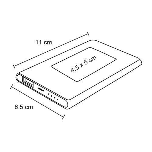 Power Bank con puerto USB y micro USB, además de indicador de carga y botón de encendido/apagado. Incluye cable de carga.