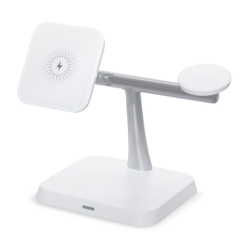 Estación de carga inalámbrica 3 en 1. Permite la carga simultanea de smartphone, earbuds y reloj inteligente. Velocidad de carga de 15 W / 5W / 3W. Incluye cable de 1m con conector tipo C y caja individual. Compatible con dispositivos que cuenten con tecnología de carga inalámbrica.