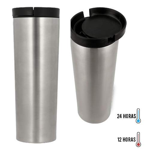 Termo de acero inoxidable de doble pared insulado al vacío y tapa enroscable con mecanismo deslizable.