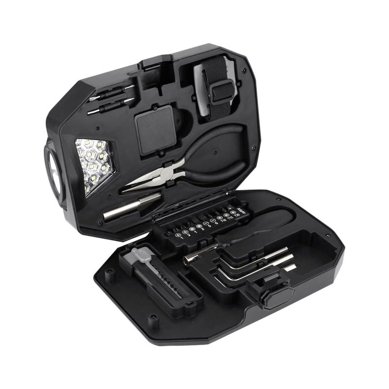 Contiene 2 desarmadores relojeros con 4 puntas distintas, dado extensión, desarmador con 10 puntas diferentes e intercambiables, 3 llaves hexagonales, pinzas de punta, flexómetro de 1m, cúter, lámpara desmontable con 13 LEDS, utiliza 3 baterías AAA (no incluidas) y correa ajustable con adaptador para lámpara. Incluye estuche.