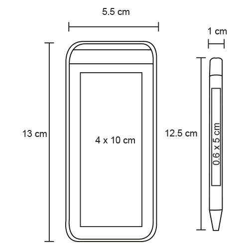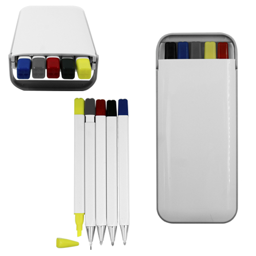 Set de escritura de plástico con asa que sirve como base que contiene: 3 bolígrafos de color (negro, rojo y azul), 1 lapicero y 1 marcatextos verde.